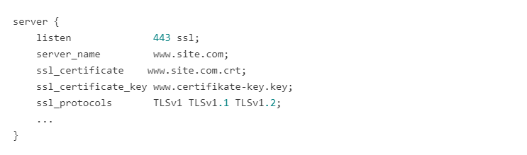 For example, to register an update of the TLS version on the Nginx server, you need to enable the SSL parameter on listening sockets, placing it in the server block. Additionally, you must specify the address of the files with the server certificate and private key: